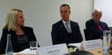 Jens Gutzmer (Gründungs-Direktor des Helmholtz-Instituts Freiberg für Ressourcen-Ttechnologie und Professor an der TU Bergakademie Freiberg), Friedrich-Wilhelm Wellmer (ehemaliger Präsident der Bundesanstalt für Geowissenschaften und Rohstoffe) und Christian Hagelüken (Leiter der Abteilung EU Government Affairs bei Umicore – zugeschaltet) stellten Handlungsoptionen vor, li. Julika Witte, acatech – Foto © Gerhard Hofmann, Agentur Zukunft für Solarify