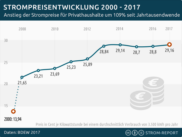 Der durchschnittliche Strompreis für Privathaushalte ist seit der Jahrtausendwende von 13,94 auf 29,16 ct/kwh gestiegen – eine Steigerung von insgesamt 109% beziehungsweise 6% pro Jahr. In diesen 29,16 Cent sind die Kosten für Stromerzeugung, Transport und alle Steuern und Abgaben enthalten. Das Portal Strom-Report teilte am 09.03.2017 die neuesten Zahlen mit.