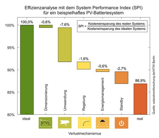 Mit SPI wurde eine neue Effizienzkennzahl entwickelt, die den ökonomischen Systemnutzen bewertet und die Schwächen der bestehenden Kennzahlen umgeht. Der SPI setzt die durch das reale PV-Batteriesystem realisierte Kosteneinsparung ins Verhältnis zum theoretischen Einsparungspotenzial eines verlustfreien Systems mit gleicher Speicherkapazität. Aus ihm lassen sich folglich die finanziellen Einbußen aufgrund einzelner Systemverluste ableiten.