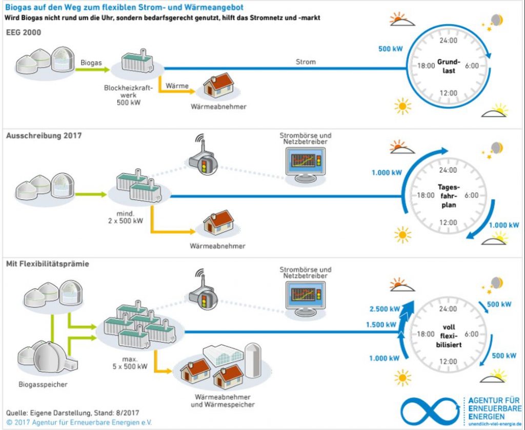 Ein solcher „Grundlast“-Betrieb sei durch frühere Fassungen des Erneuerbare-Energien-Gesetzes (EEG) angereizt worden. Stattdessen liefen Biogas-Blockheizkraftwerke (BHKW) künftig verstärkt bedarfsgerecht. Dieselbe Menge Biogas werde nicht mehr rund um die Uhr verstromt, sondern dank größerer Kapazität vor allem zu den Zeiten hoher Nachfrage. Gefragt sei jetzt das schnelle Hoch- und Herunterfahren in Abhängigkeit von Strommarkt und Stromnetz.