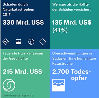 „Die extremen Naturkatastrophen des Jahres zeigen die wichtige Rolle von Versicherung, nach schweren Katastrophen die finanziellen Belastungen abzufedern. Munich Re ist bereit, dieses Geschäft weiter zu entwickeln; wir haben die dafür nötige Kapazität und Expertise. Bemerkenswert ist für mich: Einige der Katastrophen wie die Serie aus drei enorm schadenreichen Hurrikanen oder die sehr schweren Überschwemmungen in Südasien nach außerordentlich starken Monsun-Regenfällen haben einen Vorgeschmack auf die Zukunft gegeben. Denn auch wenn einzelne Ereignisse nicht direkt auf den Klimawandel zurückgeführt werden können, erwarten unsere Experten künftig häufiger solche extreme Ereignisse.“