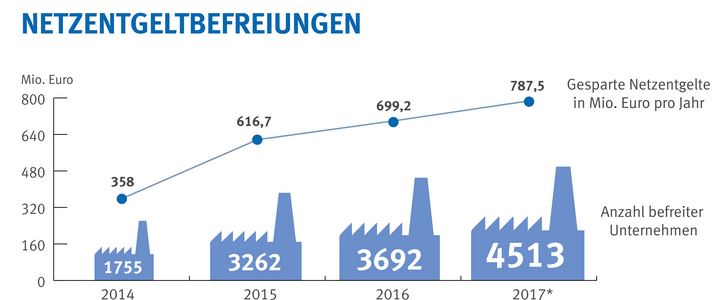 Befreiung energieintensiver Unternehmen vom Netzentgelt – Grafik © vzbv auf Basis BNetzA-Monitoringbericht (2017 voläufig)