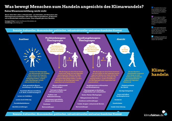 Viele Menschen kennen die Fakten zum Klimawandel – aber werden trotzdem nicht aktiv. Der Sozialforschung ist seit langem klar, dass neben dem Wissen noch viele andere Dinge nötig sind, um Menschen zum Handeln zu bewegen. Die wichtigsten Faktoren hat klimafakten in einer Infografik übersichtlich dargestellt.