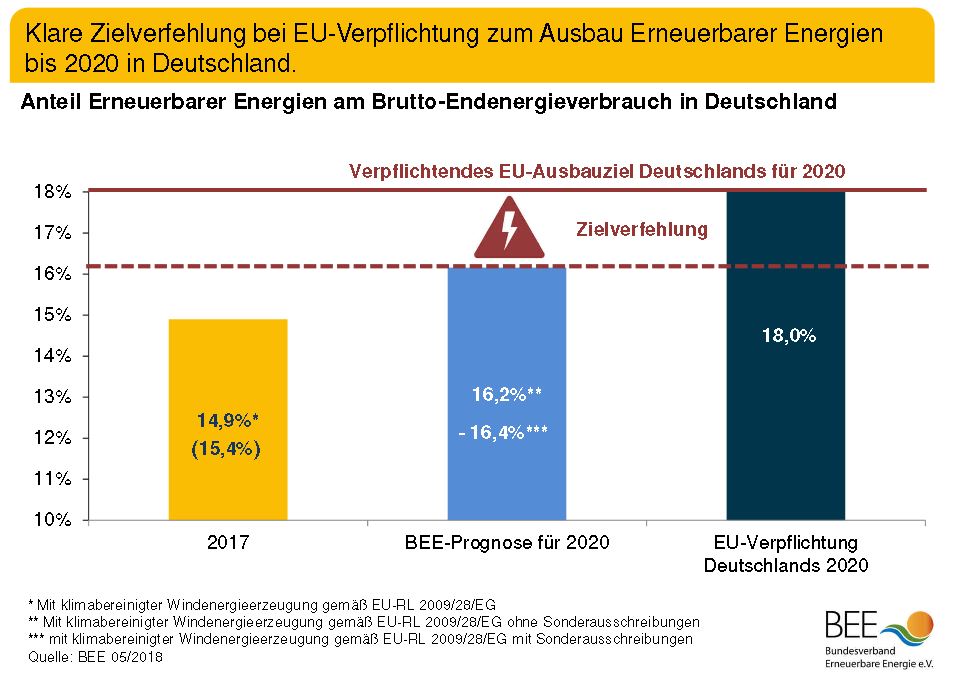 Nach einer aktuellen Prognose des Bundesverbandes für Erneuerbare Energie e.V. wird Deutschland im Jahr 2020 einen Anteil von 16,4 Prozent Erneuerbare Energien am Brutto-Endenergieverbrauch erreichen. Verpflichtend vorgegeben sind gemäß EU-Richtlinie 18 Prozent. „Die jahrelang verschleppte Energiewende im Wärme- und Mobilitätsbereich in Verbindung mit steigendem Energieverbrauch und gesetzlich abgesenkten Ausbaumengen der Erneuerbaren im Stromsektor verhindern, dass Deutschland seine rechtsverbindliche Verpflichtung einhalten wird“, rügt Simone Peter, Präsidentin des Bundesverbands Erneuerbare Energie (BEE).