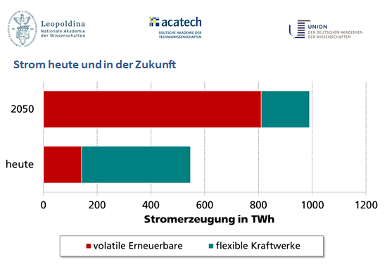 Im integrierten deutschen Energiesystem werde der Strombedarf bis 2050 steigen, und nicht, wie ursprünglich allgemein erwartet (Effizienz!), sinken – wobei sich bei der Stromerzeugung die Verteilung in volatile Erneuerbare und flexible Kraftwerke mehr als umkehrt: