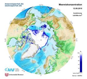 Wenn in diesen Septembertagen die Sommerschmelze des arktischen Meereises endet, wird die Eisdecke voraussichtlich auf eine Ausdehnung von 4,4 (+/- 0,1) Millionen Quadratkilometer geschmolzen sein, dem sechstkleinsten Wert seit Beginn der Messungen im Jahr 1979. Das berichteten Wissenschaftler des Alfred-Wegener-Institutes, Helmholtz-Zentrum für Polar- und Meeresforschung (AWI) und der Universität Bremen in einer gemeinsamen Presseerklärung am 13.09.2018.