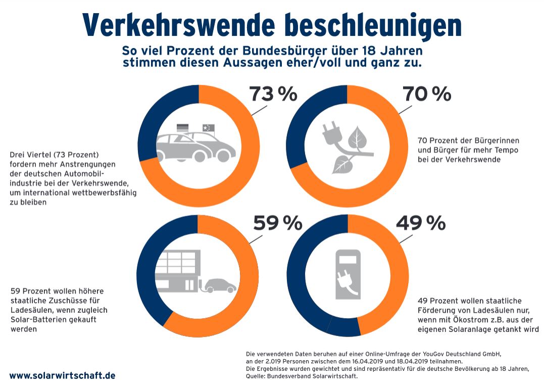 Die deutliche Mehrheit der Deutschen spricht sich für größere Anstrengungen im Verkehrsbereich für den Klimaschutz aus: 70 Prozent der volljährigen Bürger sagen, es brauche deutlich mehr Tempo bei der Verkehrswende, um die Klimaschutzziele zu erreichen. In der Pflicht sehen die Deutschen dabei allerdings nicht nur die Politik: Die deutsche Autoindustrie müsse bei der Verkehrswende mehr Gas geben, um international wettbewerbsfähig zu bleiben, sagen 73 Prozent der Befragten. Das teilte der Bundesverband Solarwirtschaft auf Basis einer repräsentativen Studie des Meinungsforschungsinstituts YouGov am 13.05.2019 in Berlin mit.
