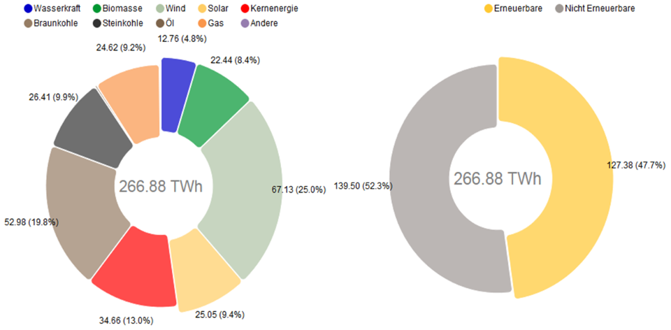In Summe produzierten die erneuerbaren Energiequellen Solar, Wind, Wasser und Biomasse im ersten Halbjahr 2019 ca. 127,4 TWh. Sie liegen damit um ca. 6,7% über dem Niveau des Vorjahres mit 119,4 TWh. Der Anteil an der öffentlichen Nettostromerzeugung, d. h. dem Strommix, der tatsächlich aus der Steckdose kommt, liegt bei ca. 47%. Der Anteil der Erneuerbaren Energien an der gesamten Bruttostromerzeugung beträgt ca. 41%. Die Bruttoerzeugung enthält auch die Eigenerzeugung der Industrie (Betriebe im verarbeitenden Gewerbe sowie im Bergbau und in der Gewinnung von Steinen und Erden) sowie die internen Verluste der konventionellen Kraftwerke. Beide Anteile werden nicht in das öffentliche Stromnetz eingespeist.