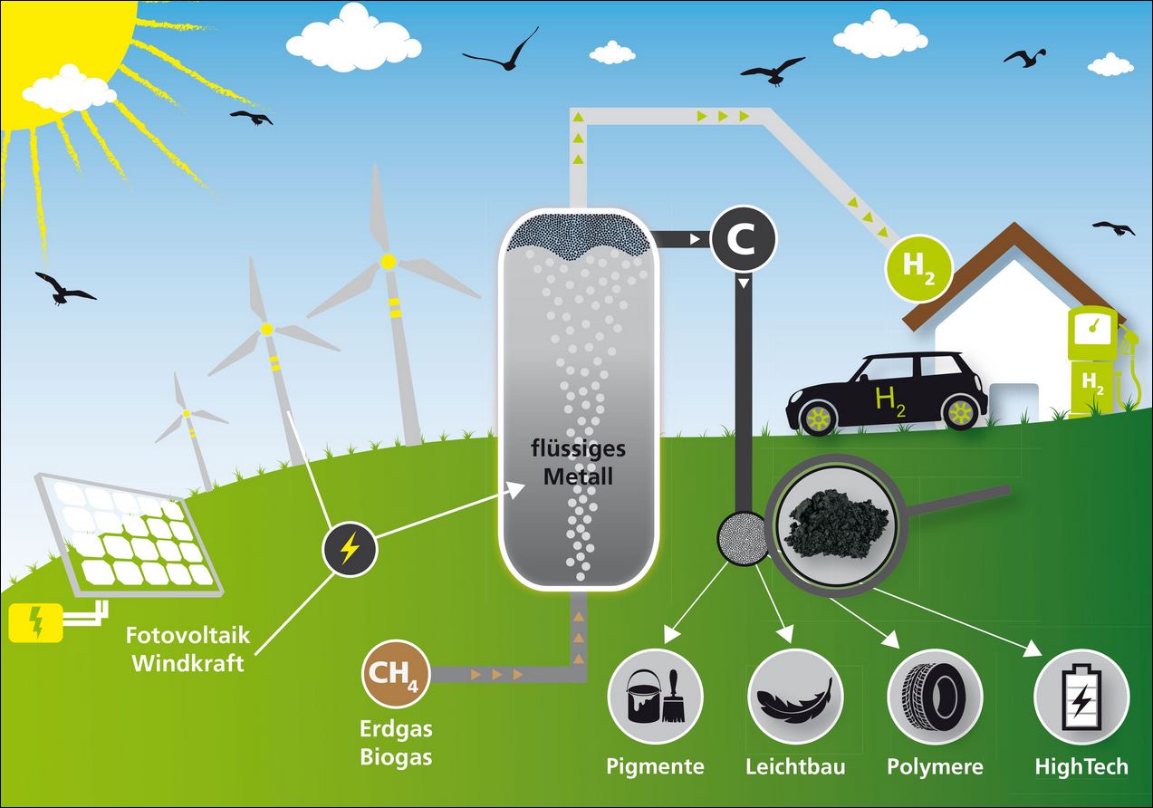 „Die direkte thermische Spaltung von Methan und anderen Kohlenwasserstoffen bietet eine Möglichkeit, um Wasserstoff aus Erdgas herzustellen – und zwar ohne direkte CO2-Emissionen“, erklärt Professor Thomas Wetzel vom Institut für Verfahrenstechnik des KIT. Seine Forschungsgruppe am KIT entwickelte dafür zusammen mit dem Institute for Advanced Sustainability Studies e. V. in Potsdam ein Verfahren, bei dem Methan in einem mit Flüssigmetall befüllten Blasensäulenreaktor kontinuierlich in seine Bestandteile zerlegt wird: in Wasserstoff und festen Kohlenstoff. Der Kohlenstoff kann als Reinstoff in fester Form sicher gelagert und in vielen industriellen Bereichen genutzt werden. Der Wasserstoff wiederum lässt sich als sauberer Energieträger im Strom-, Wärme- und Mobilitätsbereich nutzen oder in industriellen Prozessen einsetzen, beispielsweise bei der Herstellung von Stahl.