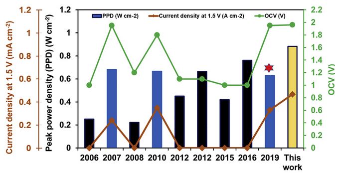 Die Abbildung fasst die Leerlaufspannungen der repräsentativen DBFC-Leistung in grün und die Stromdichte bei 1,5 V in orange zusammen. DBFCs mit Spitzenleistungsdichte bei hoher Spannung (>1 V) werden durch blaue Säulen und solche mit Spitzenleistungsdichte bei niedriger Spannung (<1 V) werden durch schwarze Säulen dargestellt. Die Arbeit des vorliegenden Artikels wird durch die gelbe Spalte hervorgehoben. (Mit freundlicher Genehmigung: Ramani Lab)