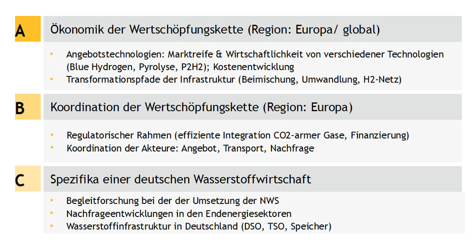 Im Rahmen des Programms erstellt und veröffentlicht das ewi kontinuierlich Analysen und Forschungsbeiträge und führt studienbezogene Veranstaltungen durch. So wird ein Beitrag zur politischen und gesellschaftlichen Debatte geleistet sowie die wasserstoff- und gaswirtschaftliche Forschungskompetenz am Institut weiter ausgebaut. Unter anderem werden die folgende Fragen untersucht: