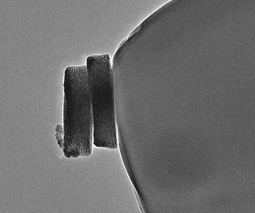 Zwei Kobaltoxidpartikel auf einer Kohlenstoff-Nanoelektrode – Foto © T. Quast, RUB