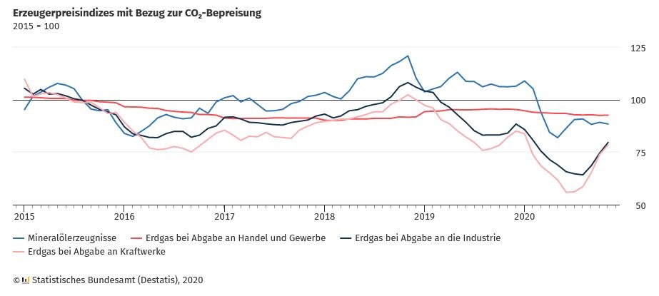 Die rückläufige Entwicklung der Erzeugerpreise für Mineralölerzeugnisse und Erdgas im Frühjahr 2020 wurden auch durch die Corona-Pandemie beeinflusst. So ließ die Nachfrage nach Erdöl weltweit nach und in der Folge sanken aufgrund eines Überangebots bei begrenzten Lagerkapazitäten die Weltmarktpreise für Erdöl. Dies führte kurzzeitig im April 2020 sogar zu negativen Rohöl-Weltmarktpreisen. Die Verbraucherpreise für fossile Kraftstoffe, Heizöl und Gas waren zusätzlich durch die temporäre Mehrwertsteuersenkung beeinflusst.