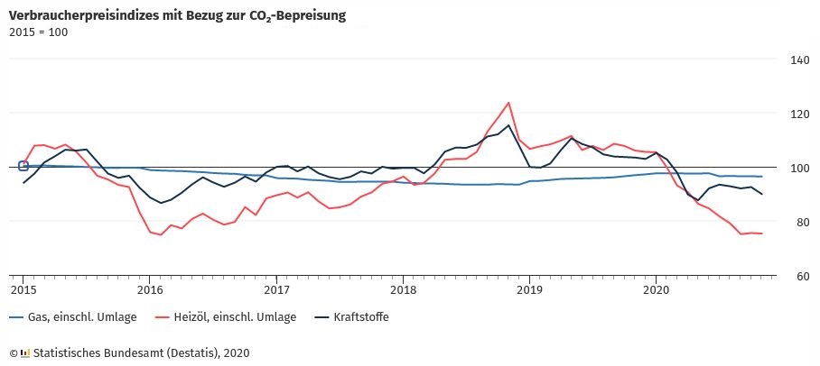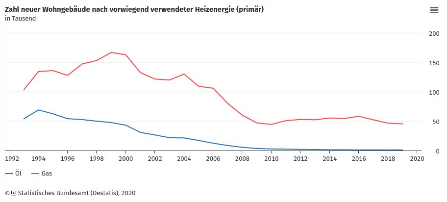 Am 01.01.2021 tritt die CO2-Abgabe von 25 Euro je Tonne ausgestoßenem Kohlendioxid in Kraft. So soll der Einsatz fossiler Energieträger in der Mobilität und für die Wärme in Gebäuden reduziert werden. Wie das Statistische Bundesamt (Destatis) am 28.12.2020 mitteilte, waren von den im vergangenen Jahr insgesamt 108.100 neuen Wohngebäuden 42,8 % mit einer Öl- oder Gasheizung ausgestattet. Vor zwanzig Jahren betrug dieser Anteil noch 93,1 %.