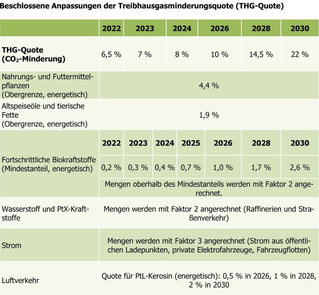 Mit der Gesetzesnovelle wird die EU-Richtlinie für erneuerbare Energien im Verkehr umgesetzt (RED II), die im Jahr 2030 bei 14 Prozent am gesamten Energieverbrauch im Verkehrssektor liegen müssen. Die Bundesregierung will diese EU-Vorgaben deutlich übertreffen und den Anteil auf 28 Prozent erhöhen. Deutschland erfüllt diese EU-Vorgaben mittels Treibhausgasminderungs-Quote (THG-Quote) im Bundesimmissionsschutzgesetz. Mit der THG-Quote werden Mineralölunternehmen verpflichtet, die Treibhausgasemissionen ihrer Kraftstoffe um aktuell sechs Prozent zu senken. Dazu können sie klimafreundliche Energieerzeugnisse wie grünen Wasserstoff, Strom oder fortschrittliche Biokraftstoffe einsetzen. Laut Gesetzesnovelle steigt die THG-Quote bis 2030 schrittweise auf 22 Prozent.