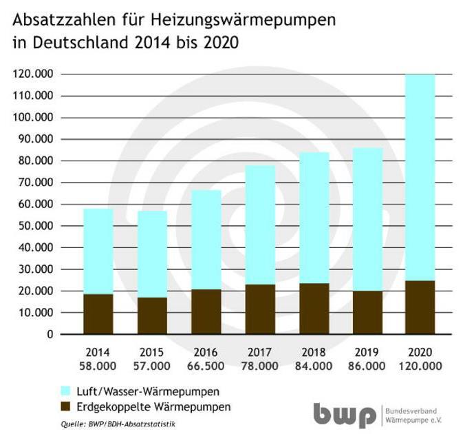 Im vergangenen Jahr wurden in Deutschland etwa 120.000 Wärmepumpen neu installiert – ein Viertel davon in Bestandsgebäuden. Die Energiewende im Heizungskeller nimmt Fahrt auf – so Sven Ulrich in ErneuerbareEnergien am 28.01.2021. In Deutschland wurden im vergangenen Jahr 120.000 neue Heizungswärmepumpen installiert. Das entspricht einem Wachstum um 40 Prozent im Vergleich zum Vorjahr, als noch etwa 86.000 Heizwärmepumpen installiert wurden, wie der Bundesverband Wärmepumpe (BWP) berichtet.