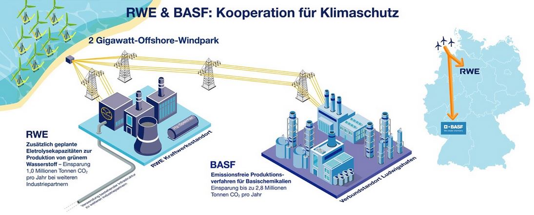 „Grüner Strom und innovative Produktionstechnik könnten den Chemiestandort Ludwigshafen zu einem Leuchtturm für Klimaschutz in der chemischen Industrie machen“, verkündeten BASF SE und RWE AG in einer gemeinsamen Medienmitteilung am 21.05.2021. Dafür planen der Chemieriese und der Stromgigant bei neuen Technologien für Klimaschutz zusammenzuarbeiten und wollen einen zusätzlichen Offshore-Windpark mit 2 GW bauen; der soll der BASF ab 2030 grünen Strom für CO2-freie Produktionsverfahren und zur Herstellung von grünem Wasserstoff liefern.