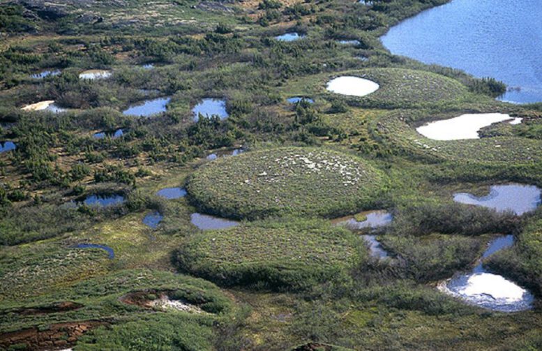 Permafrost taut auf: Gruppe durch Wachstum von Eislinsen entstandener Torfhügel – Foto © Dentren at English Wikipedia, CC BY-SA 3.0, commons.wikimedia.org