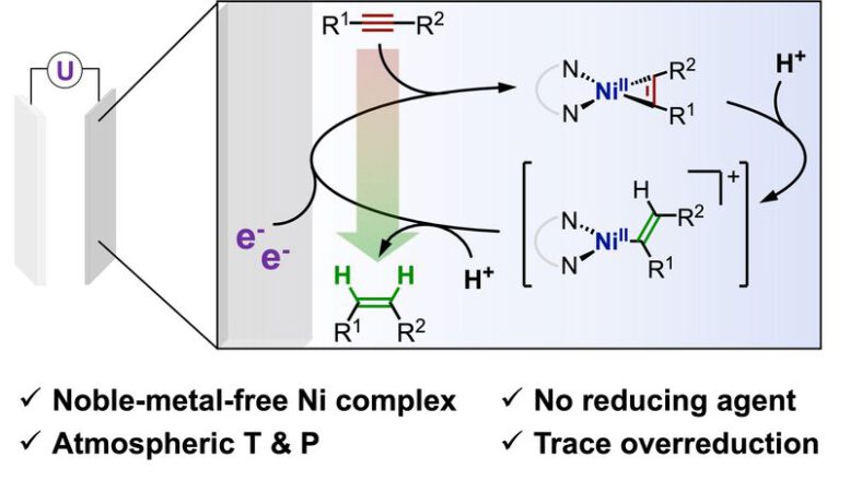 In dieser Studie zeigen die Wissenschaftler, dass die Herstellung von Olefinen aus Alkinen durch einen einfachen molekularen Nickelkomplex bei Raumtemperatur und Umgebungsdruck elektrochemisch katalysiert wird. Darüber hinaus weist das verwendete System wenig bis gar keine unerwünschte Überhydrierung zu Alkanen auf. Durch die Kopplung von elektrochemischer Analytik und Spektroskopie konnte außerdem festgestellt werden, dass der Katalysezyklus durch die Aktivierung der Alkinverbindung und nicht wie üblich durch Hydridbildung eingeleitet wird.