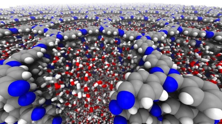 Molekulardynamische Simulation eines kovalenten, organischen Netzwerks (COF). COFs sind eine von vier Materialklassen, die in der zweiten Förderperiode des SFB 1333 weiterentwickelt werden, um Poreneffekte in der Katalyse zu untersuchen – Bild: © Universität Stuttgart / SFB 1333