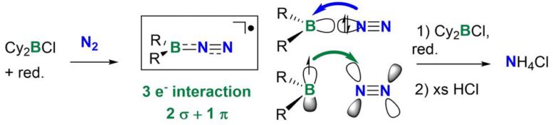 Theoretische Berechnungen wiesen dann den Weg zu Borradikalen, also Verbindungen mit einem reaktiven Boratom im Zentrum. Diese Borradikale stellten die Forschenden her, indem sie organische Bor-Halogen-Verbindungen mit einem starken Reduktionsmittel versetzten. Die entstandenen Substanzen reagierten bei Raumtemperatur mit molekularem Stickstoff zu Borylaminen, die mit wässriger Säure zu Ammoniumchlorid weiterreagierten.
