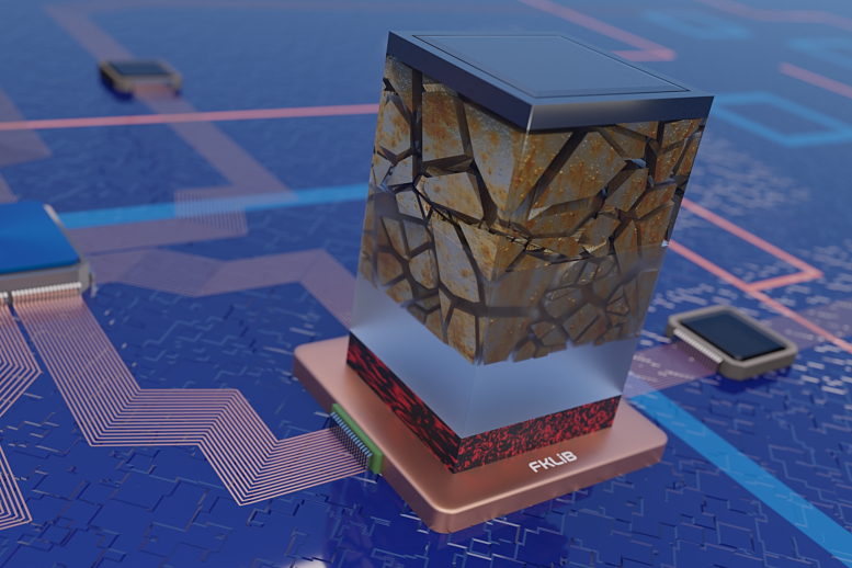 Modellhafte Darstellung einer auf einem Silicium-Wafer integrierten Festkörper-Lithium-Ionen-Batterie als Energieversorger – Grafik © B.Schröder / HZDR