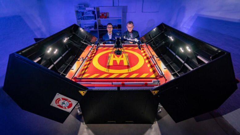 Reda Harradi (l.) und Prof. Dr. Wolfram Hardt, Technische Informatik der TU Chemnitz, testen im Labor das Zusammenspiel zwischen Drohne und Hangar. Nach dem Schließen des Hangars übernehmen jeweils drei in den beiden Klappen eingebaute Kameras mit Ringlichtbeleuchtung die KI-gestützte Inspektion der im Hangar verbliebenen Rettungsdrohne. So sollen eventuelle äußere Beschädigungen der Drohne erkannt werden – Foto © Jacob Müller