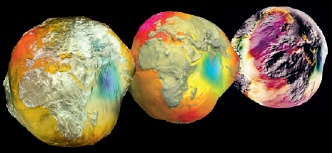 Aber auch die Abplattung der Erde ist nicht perfekt. Es gibt weitere Abweichungen, da die Verteilung der Erdmassen – und damit das gestalt-prägende Schwerefeld – räumlich ungleichförmig sind. Die Darstellung der schwerkraft-bedingten Abweichungen der Erdgestalt gegenüber dem regelmäßigen Ellipsoid ist als „Potsdamer Kartoffel“ bekannt geworden.