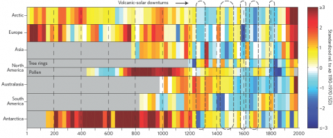 Die in Abb. 2 gezeigten Daten spiegeln das wieder: sie zeigen einige kohärente Signale, vor allem einen langfristigen Abkühlungstrend, der vom relativ warmen Mittelalter zu zunehmend kühleren Klimabedingungen führt, bis sich das im späten 19. Jahrhundert umdreht (mehr dazu im nächsten Abschnitt). Weil dem aber erwartungsgemäß regionale Variabilität überlagert ist, vor allem auf kürzeren Zeitskalen von Jahrzehnten bis zu einem Jahrhundert, stimmen besonders warme und besonders kalte Phasen im Timing auf verschiedenen Kontinenten nicht überein, wie die Autoren im Abstract hervorheben: