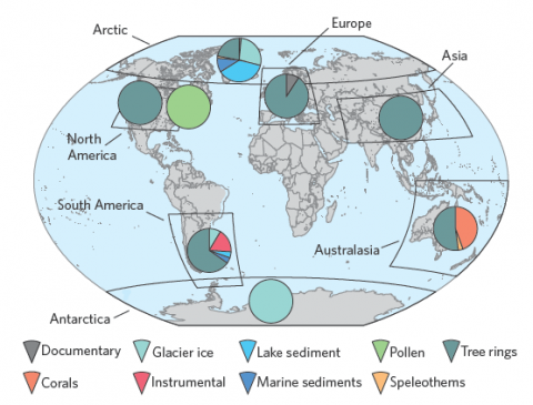 Sieben Jahre lang haben die 78 Forscher aus 24 Ländern, gemeinsam mit vielen weiteren Kollegen, im PAGES 2k Projekt an der neuen Klimarekonstruktion gearbeitet. „2k“ steht für die letzten 2000 Jahre, PAGES ist das 1991 gestartete Past Global Changes Programm. Kürzlich ist die neue Studie in Nature Geoscience erschienen. Eingeflossen sind Daten aus 511 Klimaarchiven aus aller Welt, aus Sedimenten, Eisbohrkernen, Baumringen, Korallen, Stalagmiten, Pollen oder historischen Dokumenten und Messreihen (Abb. 1). Alle Daten sind frei verfügbar.