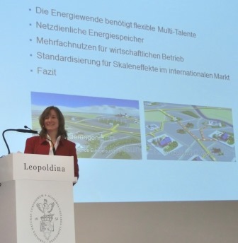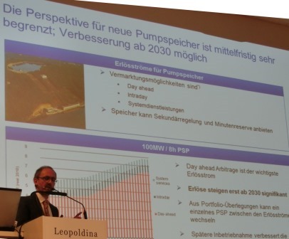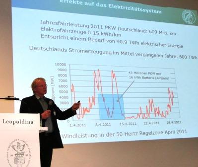 Eberhard Umbach vom KIT Karlsruhe gab einen Überblick über die Speichertechniken und die Funktionen von Batterien, die Herausforderungen und den Forschungsbedarf dazu. Angesichts einer Jahres-Gesamtstrommenge von ca. 58 TWh (integrale Energie) diagnostizierte Umbach einen Leistungsbedarf von 35 bis 85 GW. Der tatsächliche Beitrag der erneuerbaren Energien sei dabei deutlich niedriger als die installierte Leistung: Wind ca. 18 %, PVca. 11 %. Er nannte einen (künftigen) optimalen Mix von Wind zu PV von 75 : 25 als anstrebenswert – das sei eine politische Entscheidung, sagte er an den Physiker Haseloff gewandt.