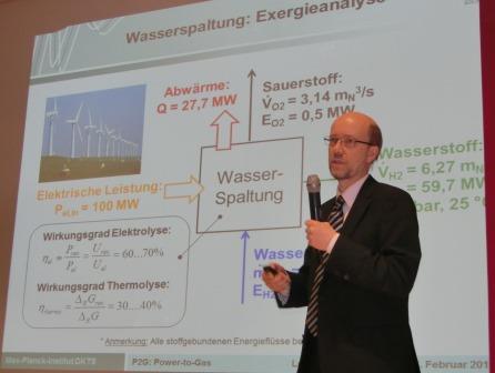 An die Vorstellung, was machen wir, wenn wir keine fossilen Energieträger mehr hätten, schloss Kai Sundmacher vom MPI für Dynamik komplexer technischer Systeme aus Magdeburg an – sein Thema: „Power-to-gas: Energetik, Dynamik, Systemdesign, Akzeptanz“. Alle Wandlungsschritte seien mit Verlusten verbunden. Also müsse – Stichwort Netzausbau – möglichst viel Energie direkt zu den Verbrauchern geschickt werden. Waaserstoff besitze nur ein Drittel der Energiedichte von Erdgas – Batterien und Pumpspeicher viel weniger. Die höchste Energiedichte hätten flüssige Kraftstoffe.
