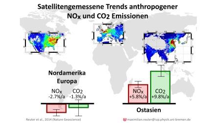 Die Ergebnisse der Umweltschutz-Bemühungen im ostasiatischen Raum geben leichten Anlass zur Hoffnung: Während die CO2-Emissionen dort weiter stark zunehmen, stieg der Ausstoß von giftigen Stickoxidgasen vergleichsweise gering. Dies belegt eine Studie des Instituts für Umweltphysik (IUP) der Universität Bremen, die am 28.09.2014 in der Fachzeitschrift „Nature Geoscience“ veröffentlicht wurde. Grundlage für die Untersuchung sind Daten des Satelliteninstruments SCIAMACHY, das vom Deutschen Zentrum für Luft- und Raumfahrt (DLR) gefördert wurde. Die Auswertung der Satellitendaten ergab, dass der Ausstoß von Kohlenstoffdioxid im ostasiatischen Raum zwischen 2003 und 2011 um 9,8 Prozent pro Jahr angestiegen ist. Diese starke Zunahme der Emissionen verursachte vor allem das Wirtschaftswachstum in China.