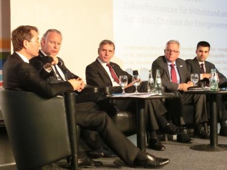 Im Verlauf der ersten Plenardiskussion teilte Eckhardt Rümmler von E.ON Climate and Renewables GmbH, der „sauberen“ E.ON-Abspaltung, mit, sie hätten eingesehen, dass man stärker vom Kunden als vom Unternehmen her denken müsse – und das in drei Säulen: Kunden, Netze und Erneuerbare Energien. Dabei müsse die Akzeptanz durch Beteiligungsmodelle erhöht werden, aber auch durch Kostenreduktion und weiteren Ausbau der Technologieführerschaft – schließlich durch größere Kundenzufriedenheit. In diesem Prozess seien die Marktzyklen klug zu nutzen, denn die neuen Geschäftsmodelle, unterschieden sich von den alten Utilities. Allerdings, so Rümmler, seien „?noch lange konventionelle Kraftwerke“ nötig um zuverlässig den Bedarf zu decken.