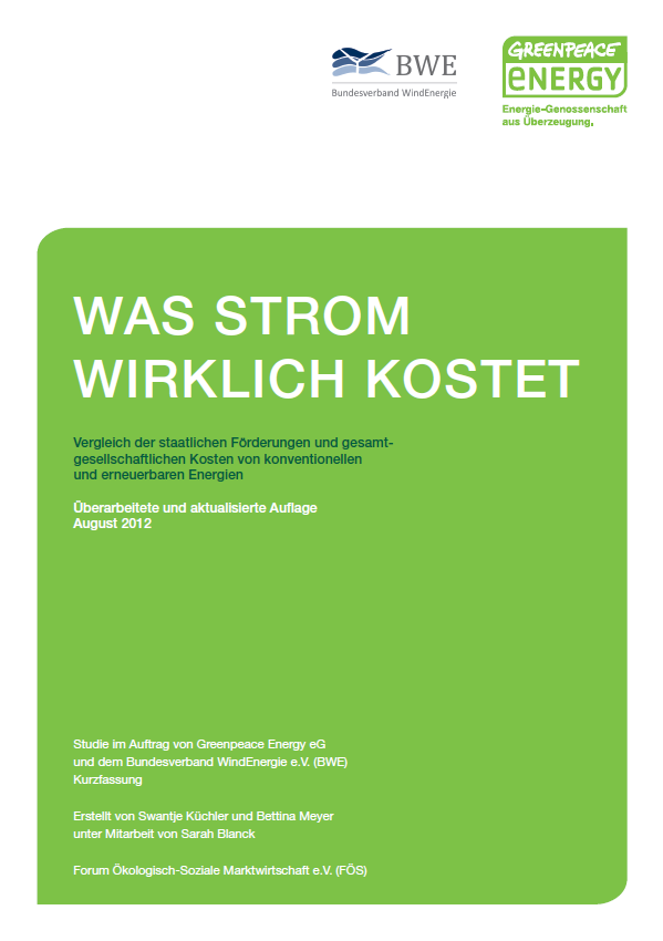 Wenn die versteckten Kosten auf den Strompreis umgelegt würden, verursachten konventionelle Energieträger wie Kohle und Atom 2015 eine finanzielle Mehrbelastung von voraussichtlich 11 ct/kWh. Dies ist ein Ergebnis der Studie Was Strom wirklich kostet, die das Forum Ökologisch-Soziale Marktwirtschaft (FÖS) im Auftrag von Greenpeace Energy erstellt hat. Damit würde die „Konventionelle-Energien-Umlage“ den Verbraucher doppelt so viel kosten wie die Umlage für Erneuerbare Energien, ohne dass er dies auf der Stromrechnung erkennen kann.