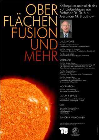 Alexander Bradshaw 70 Jahre alt geworden. Aus diesem Anlass luden die Max-Planck-Gesellschaft und die TU München am 30.01.2015 zu einem Kolloquium unter dem Titel „Oberflächen, Fusion und mehr“ ein.