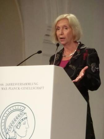 Zum Ende ihrer Rede erntete die Forschungsministerin großen Beifall, als sie die Skepsis vieler Menschen vor neuen technischen Entwicklungen und deren Folgen ansprach: Es dürfe nicht hingenommen werden, dass Wissenschaftler ein wichtiges Thema aufgäben, weil sie angefeindet würden, und sei es aus vermeintlich ethischen Motiven. Das sei „das Ende der wissenschaftlichen Freiheit“.