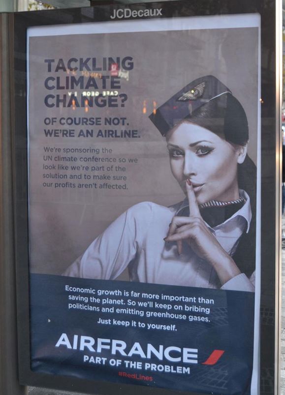 [note „Gegen den Klimawandel kämpfen? Natürlich nicht! Wir sind eine Fluggesellschaft. Wir unterstützen die Klimakonferenz, damit es so aussieht, als seien wir Teil der Lösung und unsere Gewinne unangetastet bleiben.“ Foto © Revolt Design brandalism.org.uk]