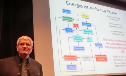 Die Energieversorgung sei systemisch: „Energiewende 1.0“ bedeute den Ausstieg aus der nuklearen Energiegewinnung – „Energiewende 2.0“ den Ausstieg aus fossilen Energieträgern. Ziel der Energiewende ist nur der systemweite Einsatz Erneuerbarer Energien. Und dazu brauchen wir die Umwandlung von Energie mittels der Chemie – die Chemische Energie-Conversion (CEC).