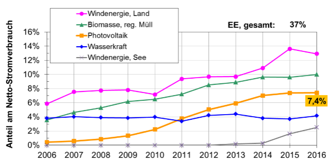 Anteil der EE am Nettostromverbrauch – Grafik ©ISE, pv-fakten