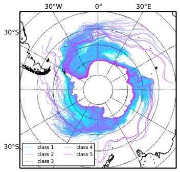 Übersicht über die modellierten Driftwege aller in der 12-Jahres-Simulation berücksichtigten Eisberge. Gut zu erkennen sind die vier „Highways“, welche die Eisberge aus der Antarktis herausführen – Grafik © Alfred-Wegener-Institut/Thomas Rackow