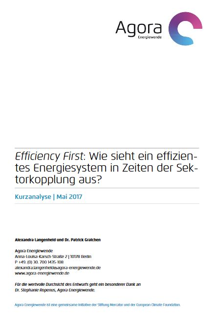 Gleichberechtigt neben dem Ausbau Erneuerbarer Energien gehört zu den wesentlichen Zielen der Energiewende auch der effizientere Umgang mit Energie: Bis 2050 soll der Primär-Energiebedarf in Deutschland halbiert und die Sanierungsrate verdoppelt werden. Am 12.05.2017 veröffentlichte Agora Energiewende die Kurz-Analyse „Efficiency First: Wie sieht ein effizientes Energiesystem in Zeiten der Sektorkopplung aus?“ eines (nötigen) Energieeffizienzgesetzes. Die Energieeffizienz reduziere nicht nur den Bau von Erzeugungsleistung, sondern auch den Ausbau von Infrastruktur, wie etwa Stromleitungen, heißt es. Infolgedessen führe die Vermeidung einer Kilowattstunde Strom zu einer volkswirtschaftlichen Ersparnis von 11 bis 15 Cent. Im Stromsystem allein könnten somit jährlich mehr als 21 Milliarden Euro gespart werden.