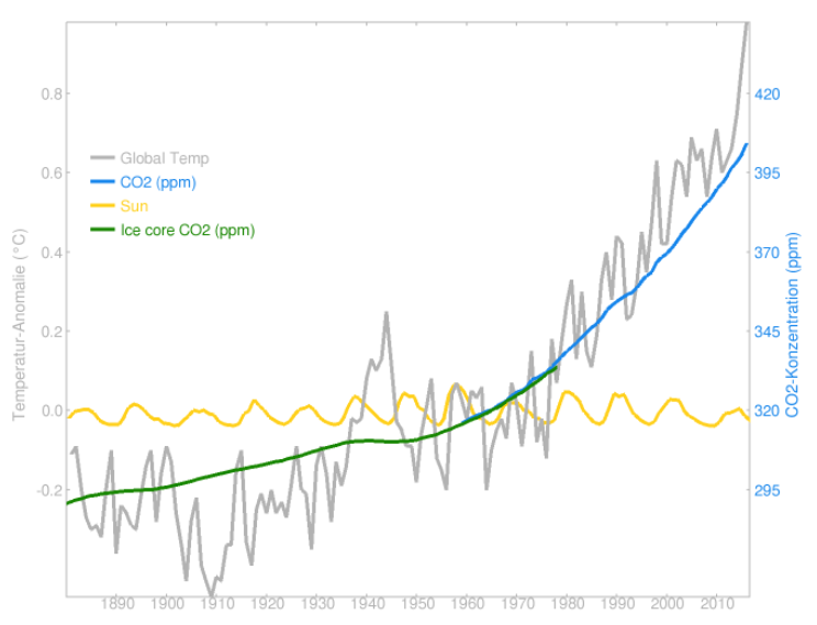 Abb. 5 erläutert Rahmstorf so: „Verlauf von globaler Temperatur, CO2-Konzentration und Sonnenaktivität. Temperatur und CO2 sind relativ zueinander so skaliert, wie es dem physikalisch erwarteten CO2-Effekt auf das Klima entspricht (d.h. beste Abschätzung der Klimasensitivität). Die Amplitude der Sonnenkurve ist so skaliert, wie es der beobachteten Korrelation von Sonnen- und Temperaturdaten entspricht. (Details sind hier erläutert.) Diese Grafik kann man sich hier erzeugen und dort auch einen Code kopieren, mit dem sich die Grafik als Widget in die eigene Website einbauen lässt (wie in meiner Homepage) – dort wird sie dann automatisch jedes Jahr mit den neuesten Messdaten aktualisiert. Dank an Bernd Herd, der dies programmiert hat.“]