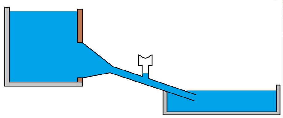 Das Venturi-Rohr im Querschnitt. Strömt das Wasser durch das Steigrohr, entsteht ein Unterdruck, der die Elastomerfolie (in der Mitte des Bildes) nach innen wölbt – Grafik © Fraunhofer ISC