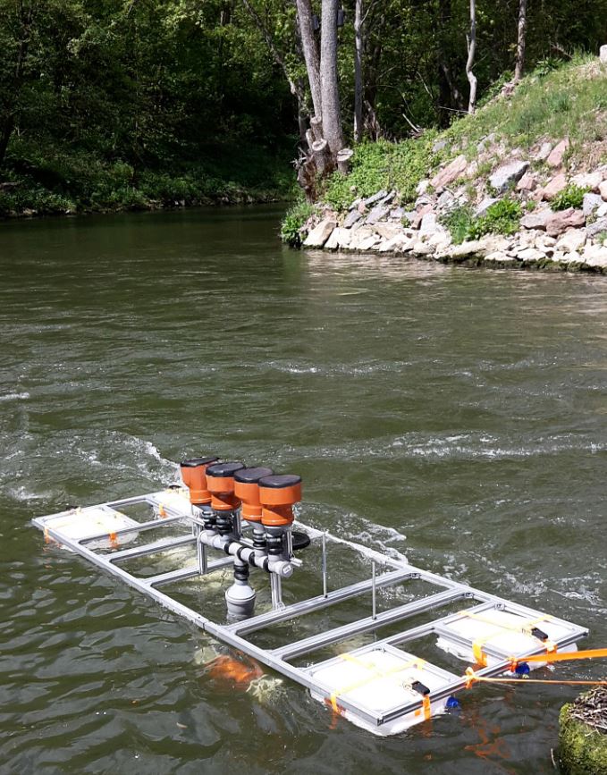 [note Feldversuch mit DEGREEN-Generatoren in einem Fließgewässer. Die Anregung der Silikonmembranen erfolgt über den Unterdruck in den wasserdurchströmten Venturi-Rohren unter dem Floß – Foto © Fraunhofer ISC]