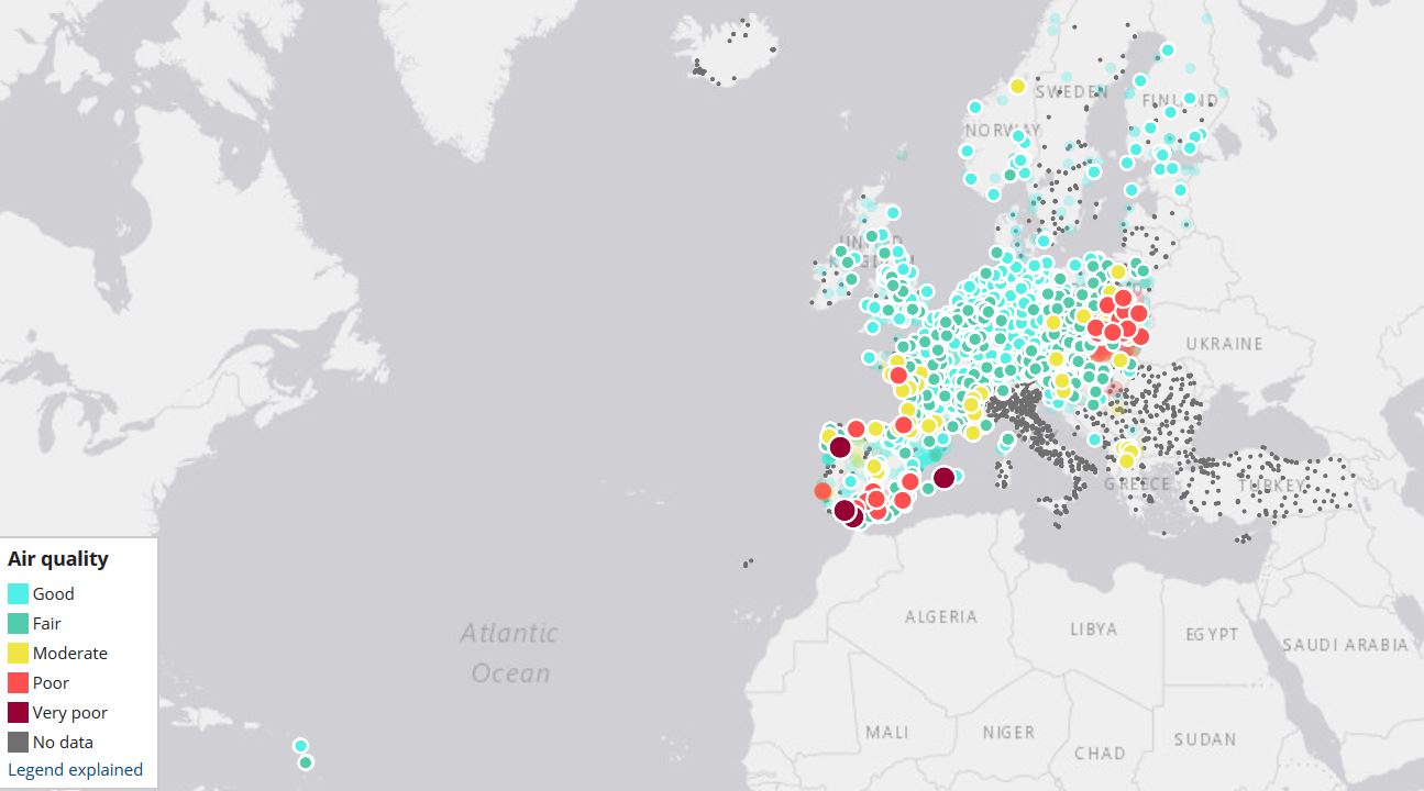 Der European Air Quality Index gibt Aufschluss über den aktuell ermittelten Stand der Luftqualität an jeder der mehr als 2.000 Messstationen in ganz Europa. Rechtsvorschriften der Europäischen Union legen sowohl Luftqualitätsstandards für kurzfristige (stündliche/tägliche) als auch für langfristige (jährliche) Belastungen durch Luftschadstoffe fest.. Der Index spiegelt daher nicht die langfristige (jährliche) Belastungssituation wider, die erheblich abweichen kann.