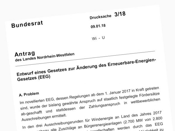 Mit einer Erhöhung der Ausschreibungsmenge um insgesamt 1.400 Megawatt im Jahr 2018 will die nordrhein-westfälische Landesregierung einem Ausbaueinbruch bei der Windenergie vorbeugen. Dies geht aus einer am 10.01.2018 veröffentlichten Bundesratsinitiative hervor. Der Landesverband Erneuerbare Energien NRW e.V. (LEE NRW) sieht darin einen zwingend notwendigen Schritt, um einen Strukturbruch in der Branche zu verhindern und den Ausbau der Windenergie zu sichern.