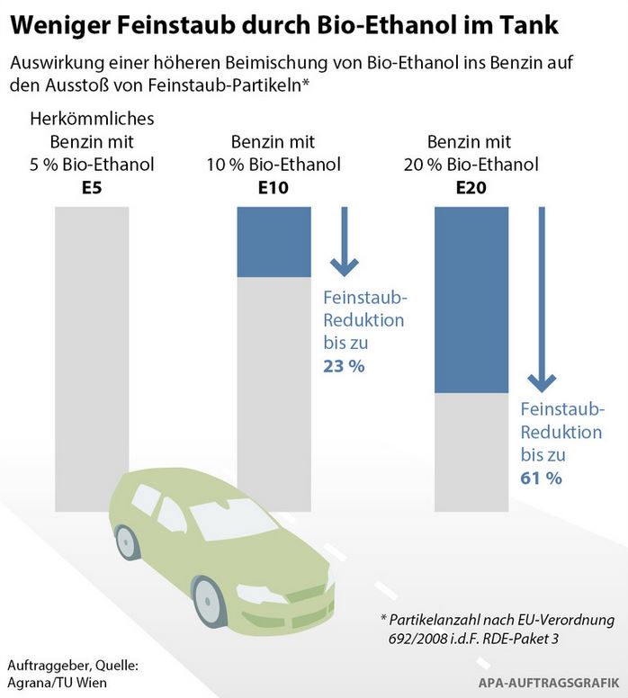 Laut einer Medienmitteilung der TU Wien haben Forscher nachgewiesen, dass die Beimischung von Bioethanol in Benzinmotoren nicht nur die CO2-Bilanz, sondern auch den Ausstoß von Feinstaub verringern würde . Eine Erhöhung des Anteils von 5 auf 10 Prozent könnte die Feinstaubwerte bis 23 Prozent senken. Die Forscher vom Institut für Fahrzeugantriebe und Automobiltechnik untersuchten den Einfluss verschieden hoher Alkohol-Anteile im Benzin auf den CO2– und Partikelausstoß benzinbetriebener Pkw.