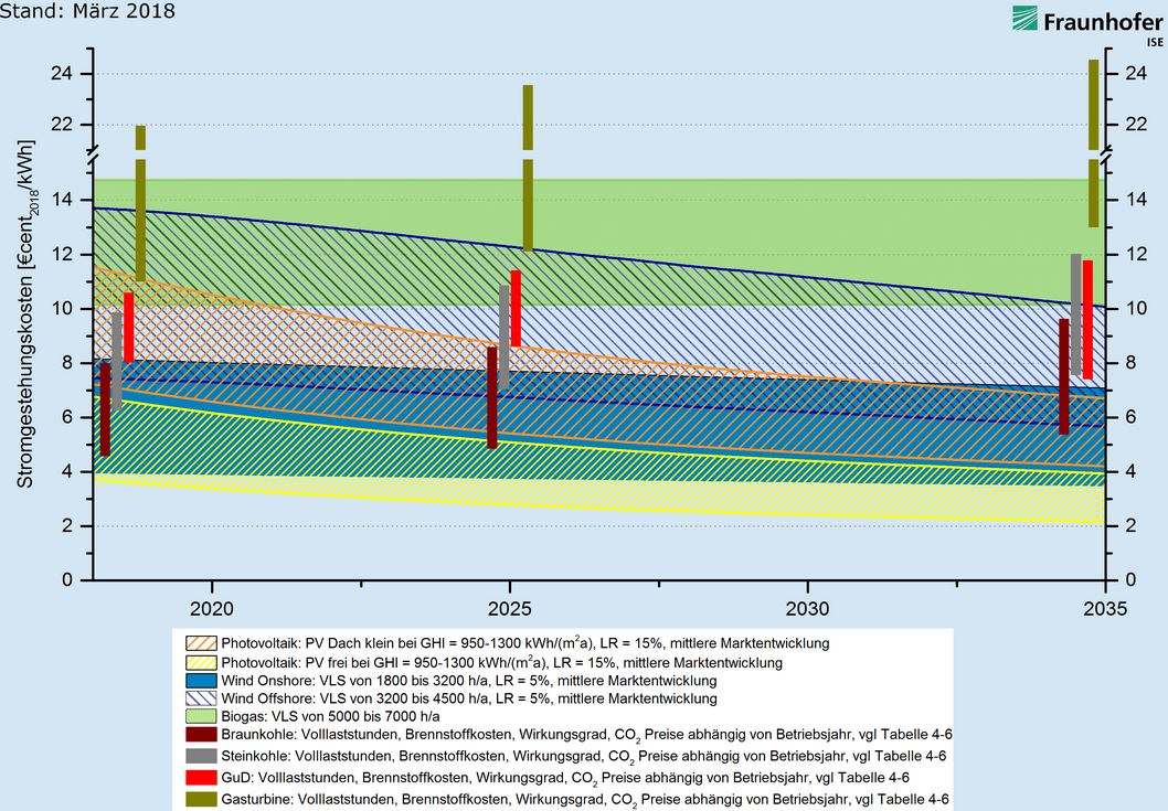 Forscher des Fraunhofer-Instituts für Solare Energiesysteme ISE haben am 20.03.2018 die vierte Auflage ihrer Studie zu den Gestehungskosten für Strom aus erneuerbaren Energien vorgelegt. Darin analysieren sie die aktuellen Kosten und prognostizieren die weitere Entwicklung auf Basis von technologiespezifischen Lernraten und Marktszenarien bis zum Jahr 2035. »Die Kostenprognosen der Vorgängerstudien haben sich bestätigt. Die Gestehungskosten für Strom aus erneuerbaren Energien sinken kontinuierlich und sind kein Hindernis für eine CO2-freie Stromerzeugung mehr. Neu errichtete Photovoltaik-Anlagen und Onshore-Windenergieanlagen an günstigen Standorten sind bereits heute günstiger als fossile Kraftwerke, und dieser Trend wird sich bis 2035 deutlich verstärken«, sagt Projektleiter Christoph Kost.