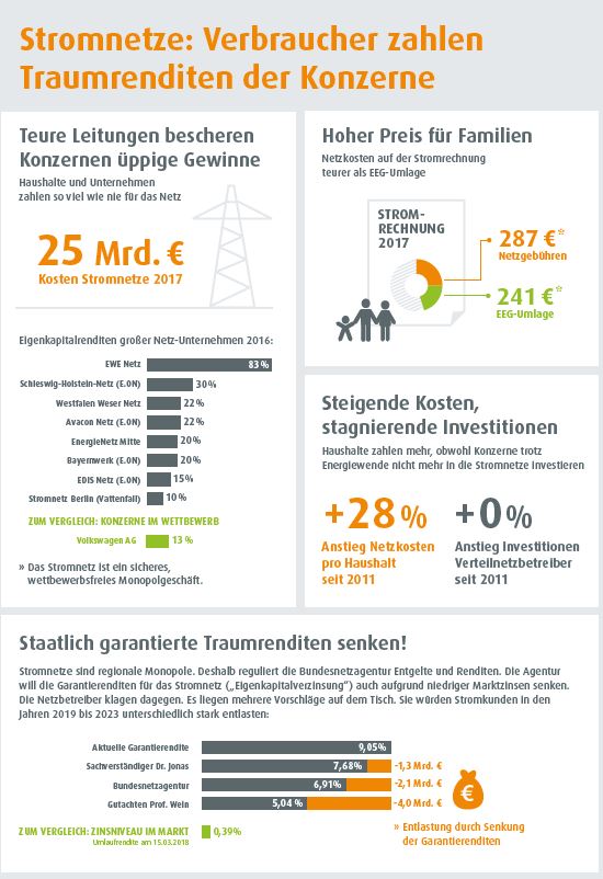 Laut einer Auswertung von LichtBlick genehmigte die Bundesnetzagentur im Jahr 2017 Netzentgelte in Höhe von 25 Milliarden Euro. Viele Netzbetreiber erzielen mit ihren Investitionen in einem weitgehend risikofreien Monopolgeschäft sehr hohe Eigenkapitalrenditen von 20 bis 30 Prozent. Während die Netz-Investitionen in Deutschland seit 2011 stabil geblieben sind, haben sich die Entgelte für Stromkunden seitdem um 28 Prozent erhöht.